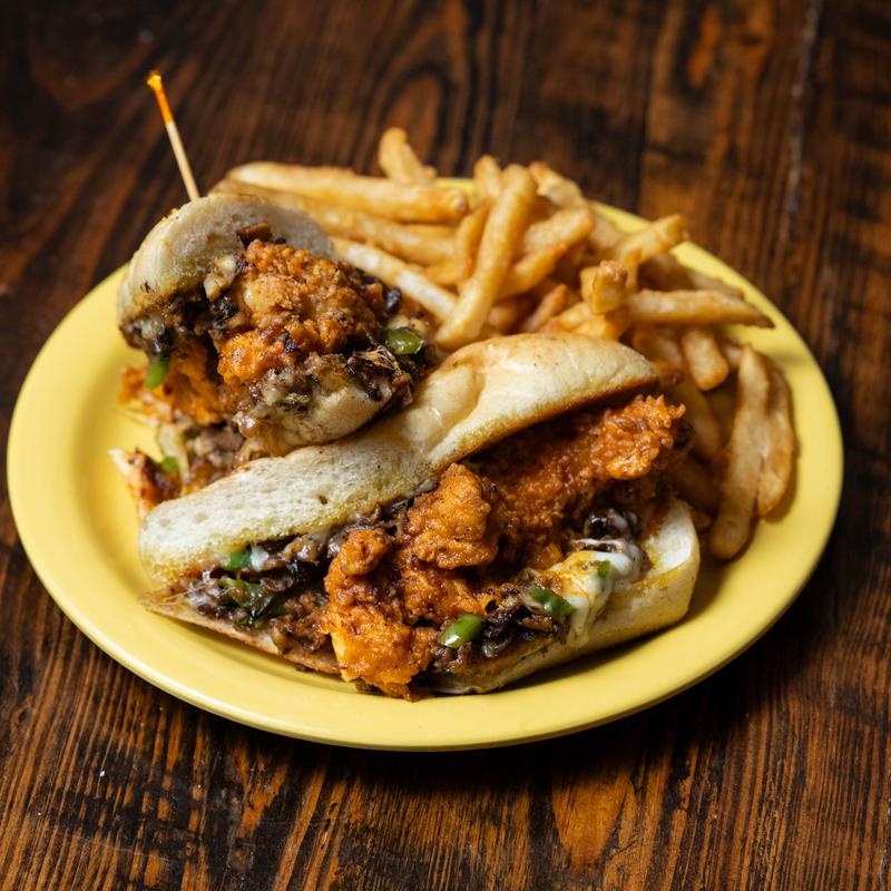 Grilled steak with peppers, onions, mushrooms & mozzarella cheese. Topped with fried chicken tossed in your favorite sauce and drizzled with ranch!
